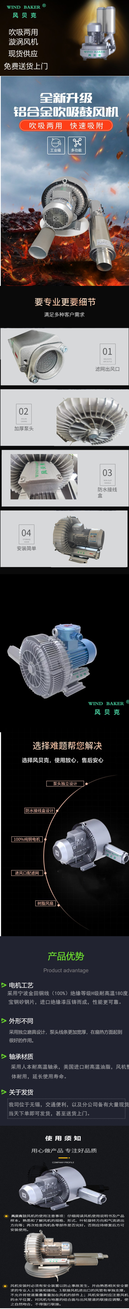 冠克雙葉輪旋渦風(fēng)機(jī) 2HB520-7HH57 風(fēng)貝克風(fēng)機(jī) 變頻防爆風(fēng)機(jī) 高壓風(fēng)機(jī)的特點(diǎn) 一般情況下,冠克高壓風(fēng)機(jī)具有以下特點(diǎn):1、具有吹吸雙功能,一機(jī)兩用,可以用吸風(fēng),也可以用吹風(fēng);還可以同時(shí)使用吸風(fēng)和吹風(fēng),相當(dāng)于旋片真空泵一樣的功能;2、少油或無(wú)油運(yùn)轉(zhuǎn),輸出的空氣是干凈的3、相對(duì)于離心風(fēng)機(jī)和中壓風(fēng)機(jī)來(lái)說(shuō),其壓力高很多,往往是離心風(fēng)機(jī)的十幾倍以上。4、如果泵體是整體壓鑄,并且使用了防震安裝腳座,那么它對(duì)安裝基礎(chǔ)的要求也是很低的,甚至可以不用固定腳座即可正常運(yùn)轉(zhuǎn),方便,也省安裝費(fèi)用和安裝周期;5、相對(duì)到其它類型的風(fēng)機(jī),比如羅茨風(fēng)機(jī),其運(yùn)轉(zhuǎn)的噪音較低,功率越大越明顯,5.5KW以上就會(huì)顯示出來(lái);6、免維護(hù)使用;它的損耗件僅僅是兩個(gè)軸承,在期之內(nèi),基本上不需要維護(hù);7、冠克高壓風(fēng)機(jī)的機(jī)械磨損微小,因?yàn)槌溯S承之外,沒(méi)其它的機(jī)械接觸部分,所以,使用壽命當(dāng)然也是長(zhǎng),只要是處于正常的使用條件下,3~5年是完全沒(méi)有問(wèn)題的。冠克高壓風(fēng)機(jī)的選型注意事項(xiàng) 由于高壓風(fēng)機(jī)的使用,因?yàn)樗倪x型也相對(duì)復(fù)雜。一般來(lái)說(shuō),需要按以下兩個(gè)步驟進(jìn)行:1、需要確定現(xiàn)場(chǎng)是使用高壓風(fēng)機(jī)的什么功能,是吸還是吹,找準(zhǔn)冠克高壓風(fēng)機(jī)對(duì)應(yīng)的壓力-流量曲線;如果看錯(cuò)曲線,有時(shí)候會(huì)造成選出來(lái)的產(chǎn)品不能使用;2、根據(jù)計(jì)算出來(lái)的壓力和流量,在曲線圖上找到同時(shí)滿足壓力和流量對(duì)應(yīng)的工作點(diǎn)以上的工作曲線;然后根據(jù)工作曲線選擇高壓風(fēng)機(jī)型號(hào);只要是不同的工作現(xiàn)場(chǎng),其對(duì)壓力和流量的需求就不一樣,所以,要想得到相對(duì)準(zhǔn)確的數(shù)據(jù),就需要進(jìn)行相關(guān)的計(jì)算。這個(gè)需要由的設(shè)計(jì)人員進(jìn)行或找的公司咨詢。
