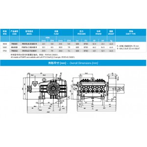 型號描述:PENTA-B 21/600 R 產品編號:790001 流量:NOM 22.1L/min 5.8GPM 丨21.0L/min 5.5GPM 壓力:600bar 8700psi 功率:24.1kw 重量44.6kg 轉速:1000 泵軸:R-右輸入軸直徑為35mm