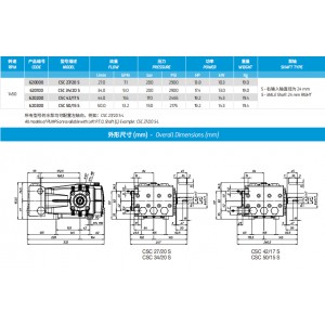 型號描述:CSC 27/20S 產品編號:620000 流量:27.0L/min 7.1GPM 壓力:200bar 2900psi 功率:13.8HP 10.3kw 重量19.0kg 轉速:1450 右輸入軸直徑為24mm