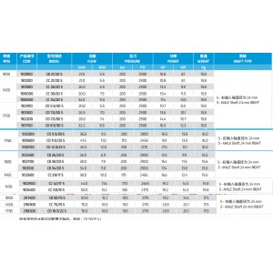 型號描述:CD5.5/30S 產品編號:902100 流量:20.8L/min 5.5GPM 壓力:200bar 2900psi 功率:10.7HP 8.0kw 重量15.8kg 轉速:1750泵軸:S-右輸入軸直徑為24mm